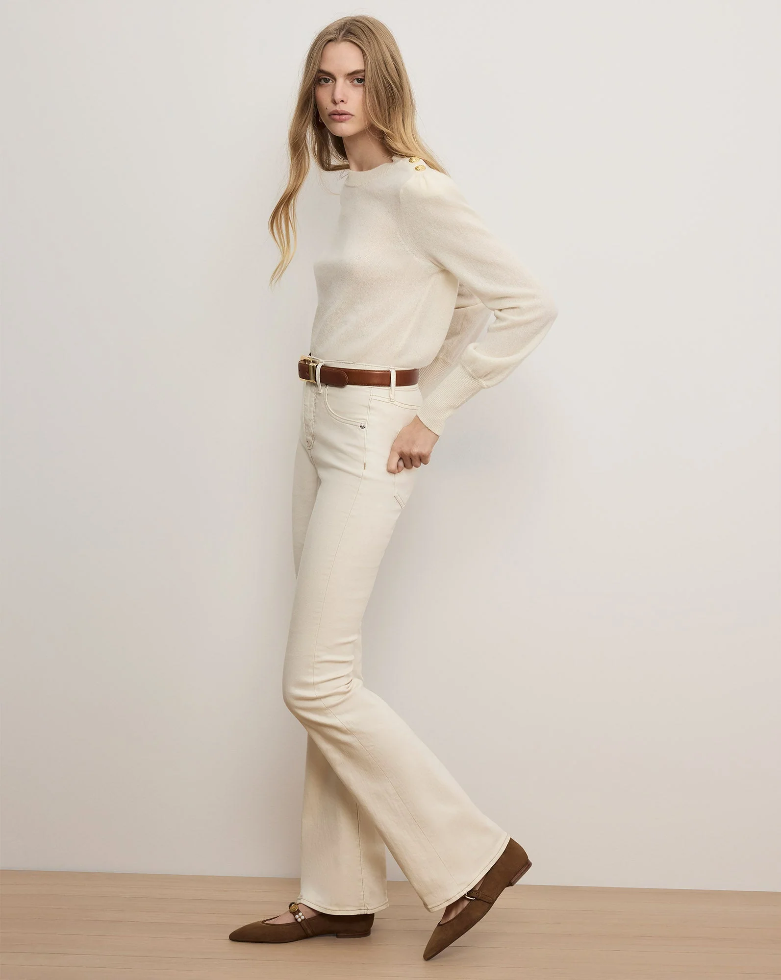 The Beverly skinny-flare jeans you know and love—now in ecru. Made in LA from super-stretch Japanese denim, this best-selling kick flare jeans style features a high-rise waist that is fitted through the hips and thighs with a subtly flared leg. Tuck in any of our tops and add sky-high heels for an elongating silhouette.