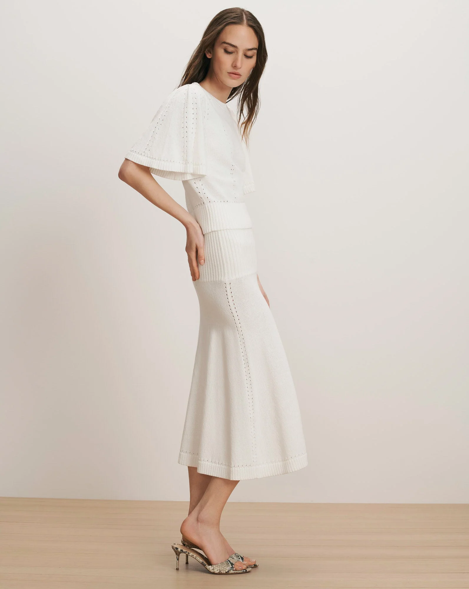 Spun from off-white cotton with an incredibly soft, crepe-like feel, the Cazian A-line skirt is knitted with delicate pointelle detailing for a lightweight, breathable finish. A wide ribbed waistband adds subtle structure, while the midi hemline works seamlessly with flats and heels alike. Pair it with tanks, sweaters, and blousesâor with the matching Rhennan top for a chic spring set.
