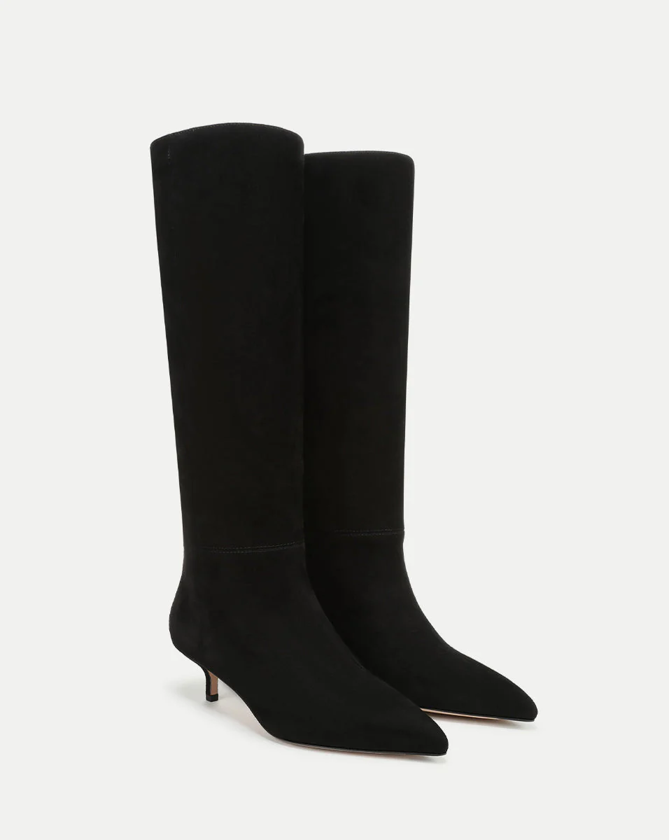 The best-selling Lisa Tall Boot, now updated with a kitten heel. Crafted in premium black suede, it features a knee-high shaft and a sleek pointed toe. A timeless addition to your closet, this pull-on style is perfect for date night and beyond. Style them with your favorite dresses and skirts; you'll get it right, every time.