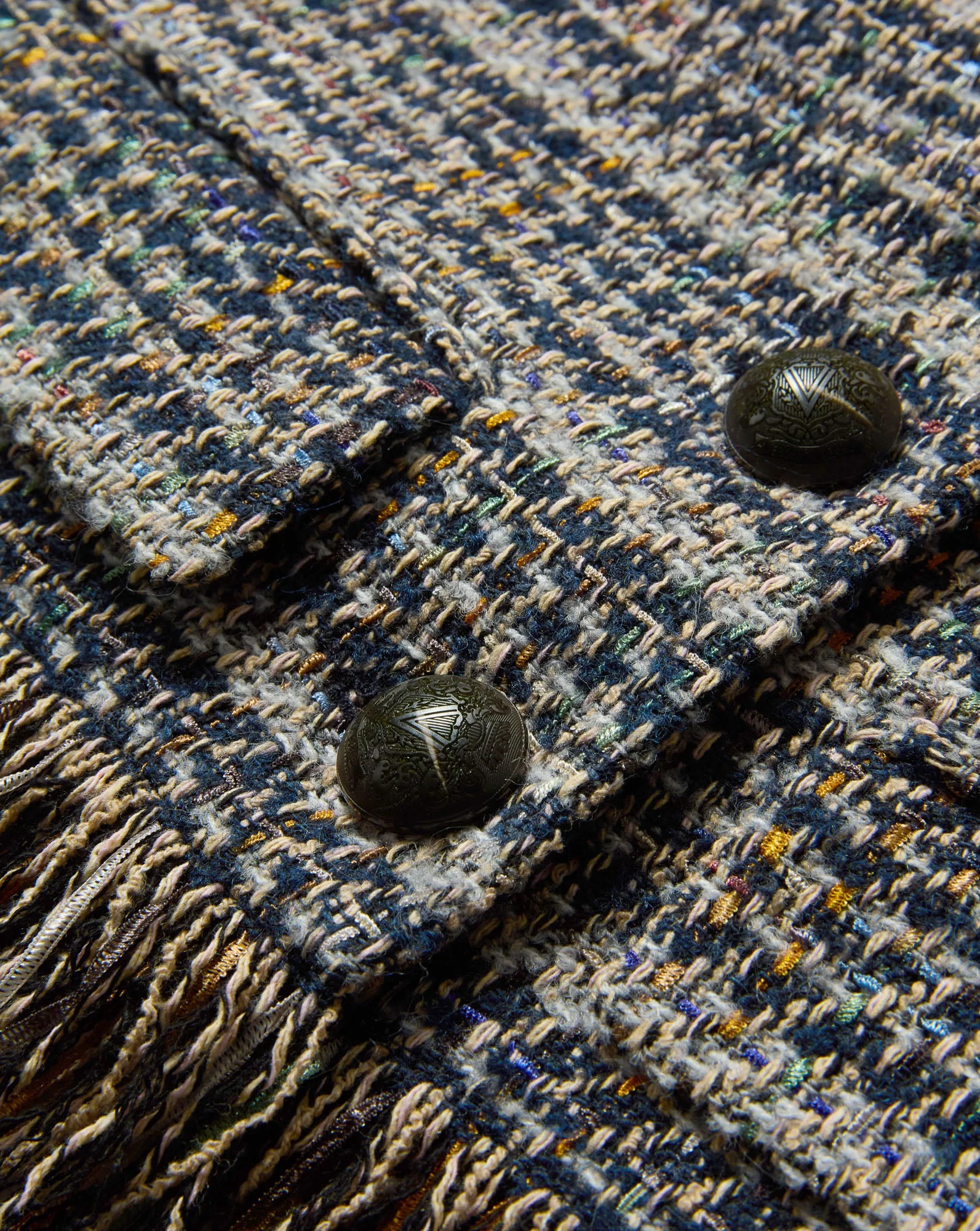 The classic lady jacket—with a boho twist. Crafted from premium Italian tweed, the Lyons features a collarless, cropped silhouette with a boxy fit, accented with multicolored fringe at the hem and sleeves for a playful, unexpected finish. Three-quarter sleeves and flap pockets complete the look. A versatile piece, wear it buttoned up as a chic one-and-done top—or layer it over a cashmere knit or tee.