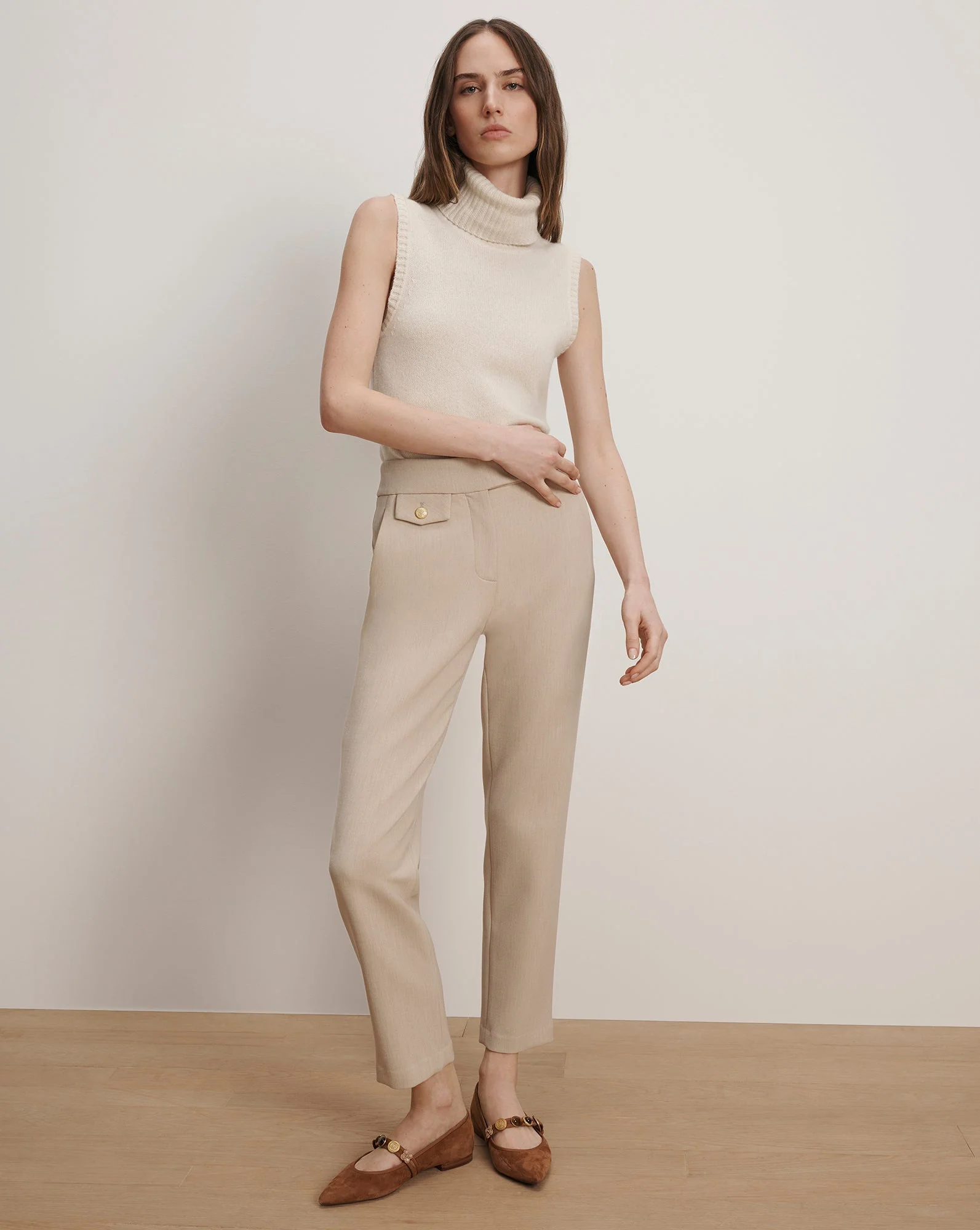 The Renzo pant you know and love, now in chic heathered beige. Everything else remains the same about this streamlined style—a cropped slim leg, high-rise waist, and our signature crest buttons. A go-to for the office, wear it with a feminine blouse and statement heels for an elevated uptown look, or pair it with the Miller Dickey Jacket for a tailored set.