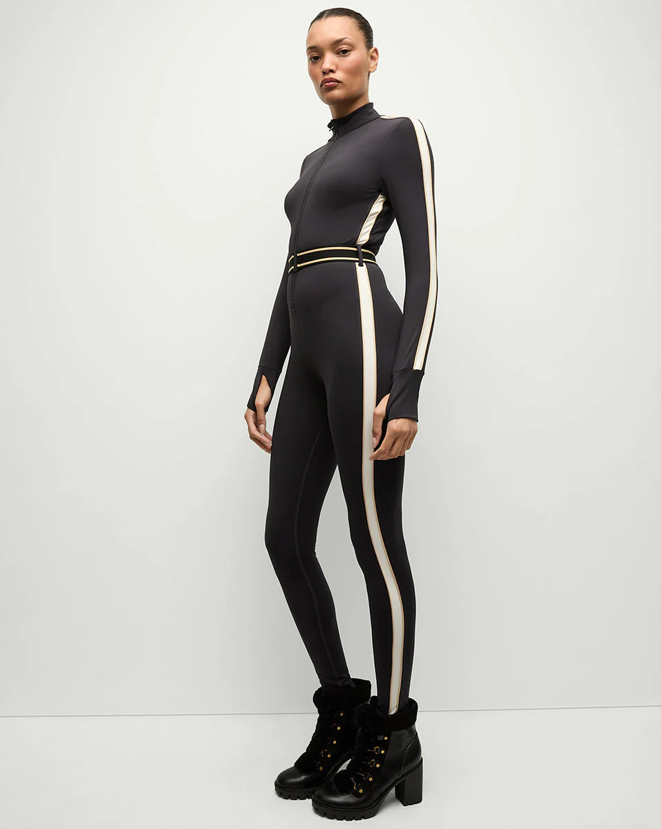 Sleek and streamlined, the Rio Nova is designed for hitting the slopes in style. Made from a premium stretch blend, the mock-neck jumpsuit features a slim fit, a zip front and a removable buckle belt. We added contrast-color side stripes for a lengthening effect and thumb holes at the cuffs for ease. Pair with the Fairbanks Fox puffer for the ultimate in cold comfort and, for even more warmth, wear as the foundational layering piece—for both on- and off-piste adventures.