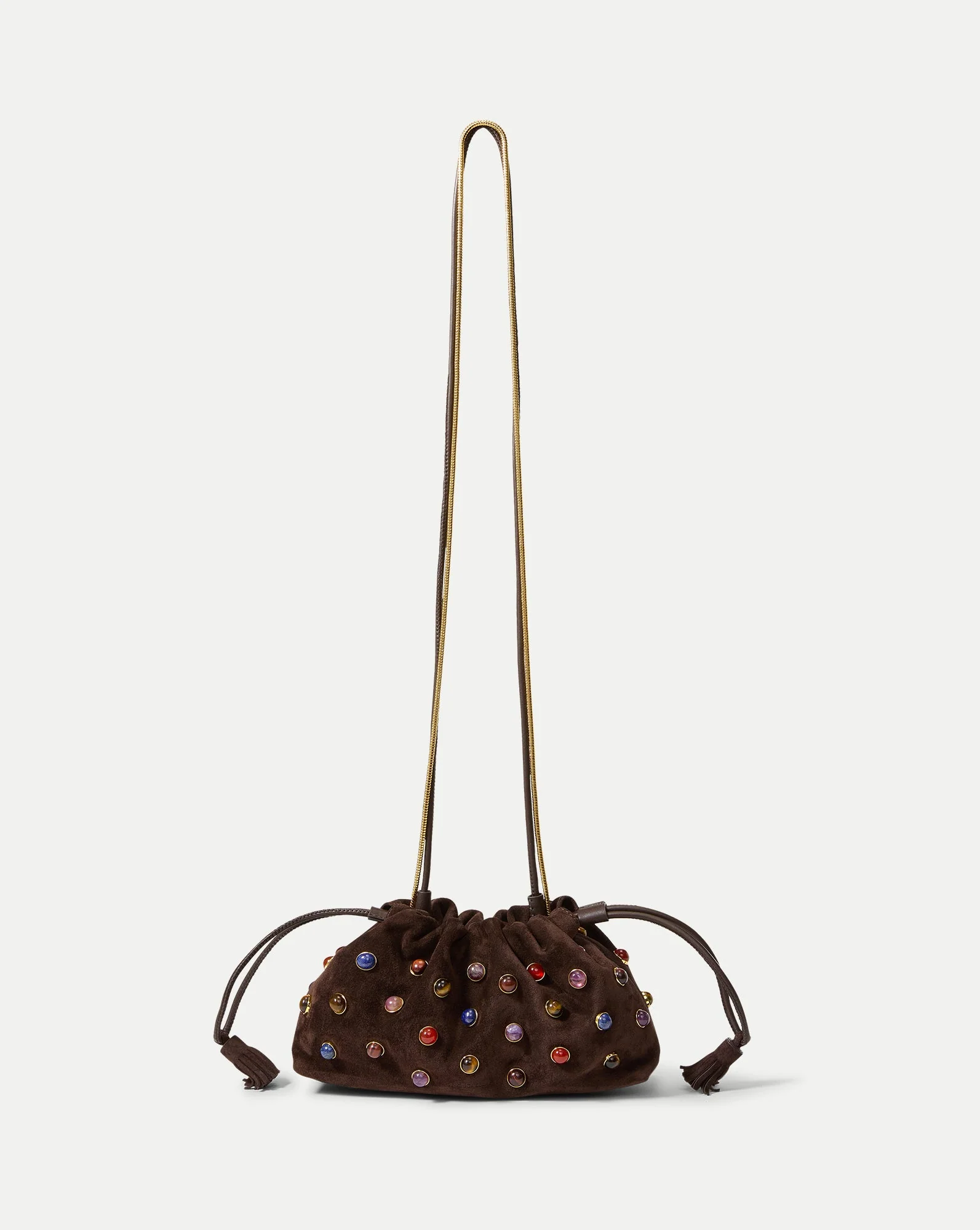 A petite, statement-making take on our classic Stash bag. Crafted from premium Italian suede in dark brown and embellished with natural cabochon stones, this pouch features a softly structured silhouette with a gathered, cinchable top, finished with leather tasseled drawstrings at both ends. Two strapsâone in smooth leather, the other a gold snake chainâoffer maximum versatility. Inside, a zip pocket and magnetic tab closure keep your essentials secure.