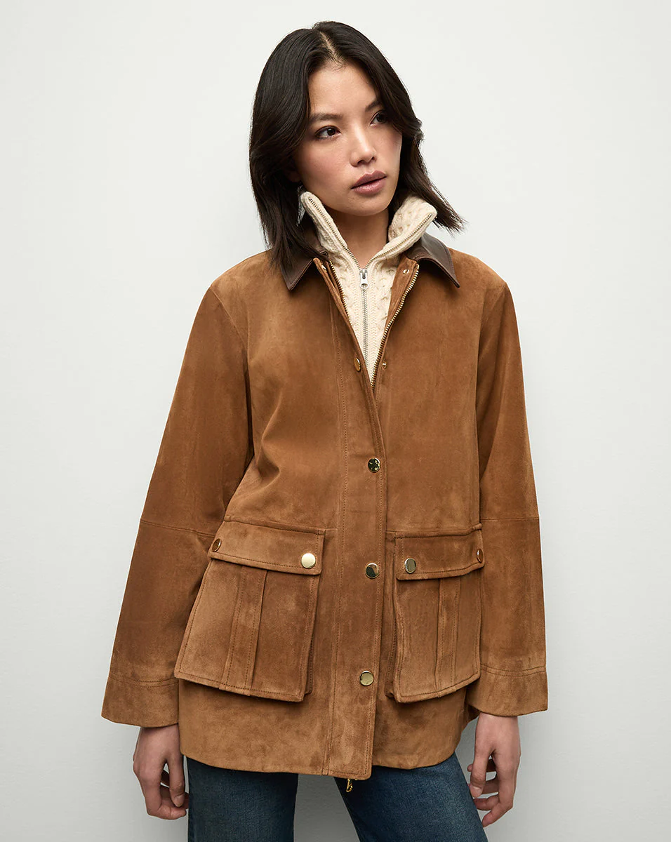 An elevated take on the outdoorsy chore coat. The Suz features all the traditional detailsâan elongated, boxy fit and oversized bellow pocketsâin luxurious Italian suede. A leather collar and gold hardware complete the look. Equal parts utilitarian and chic, this cold-weather go-to is also dickey compatible.