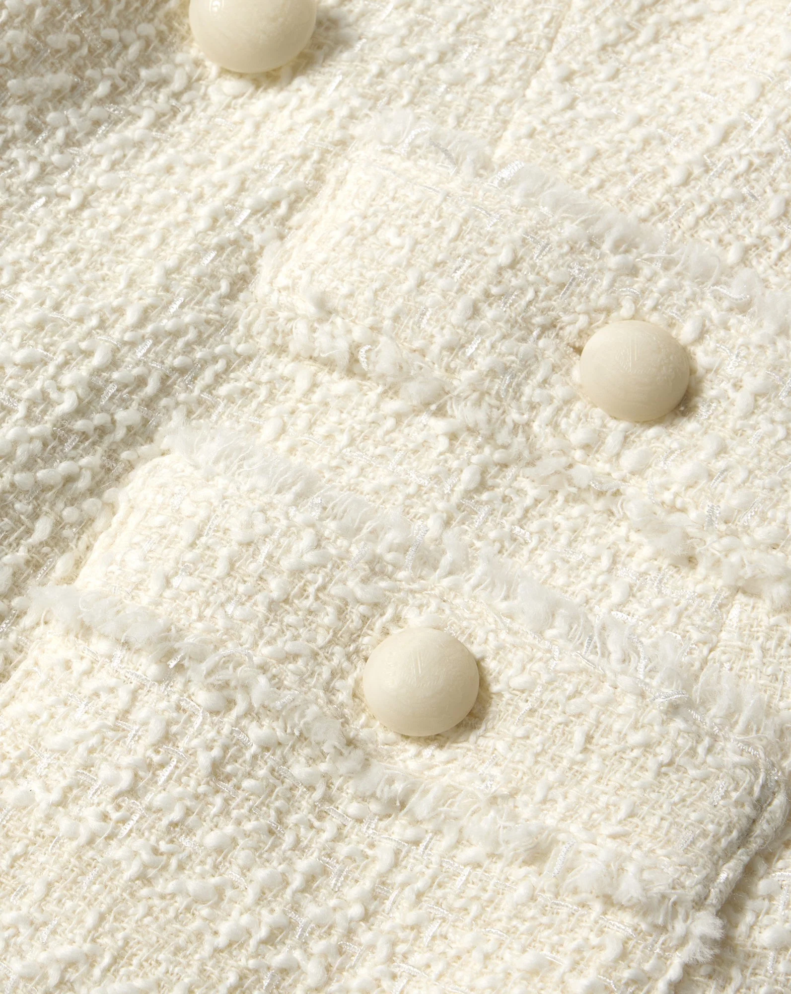 Tailored to perfection. Crafted from off-white Italian tweed, the Yves jacket features a slim, waist-defining fit with a clean, collarless double-breasted silhouette. A cutaway hem further accentuates the waist, while fringe-trimmed patch pockets add dimension. Style with denim and a heeled bootie for a classic VB look.